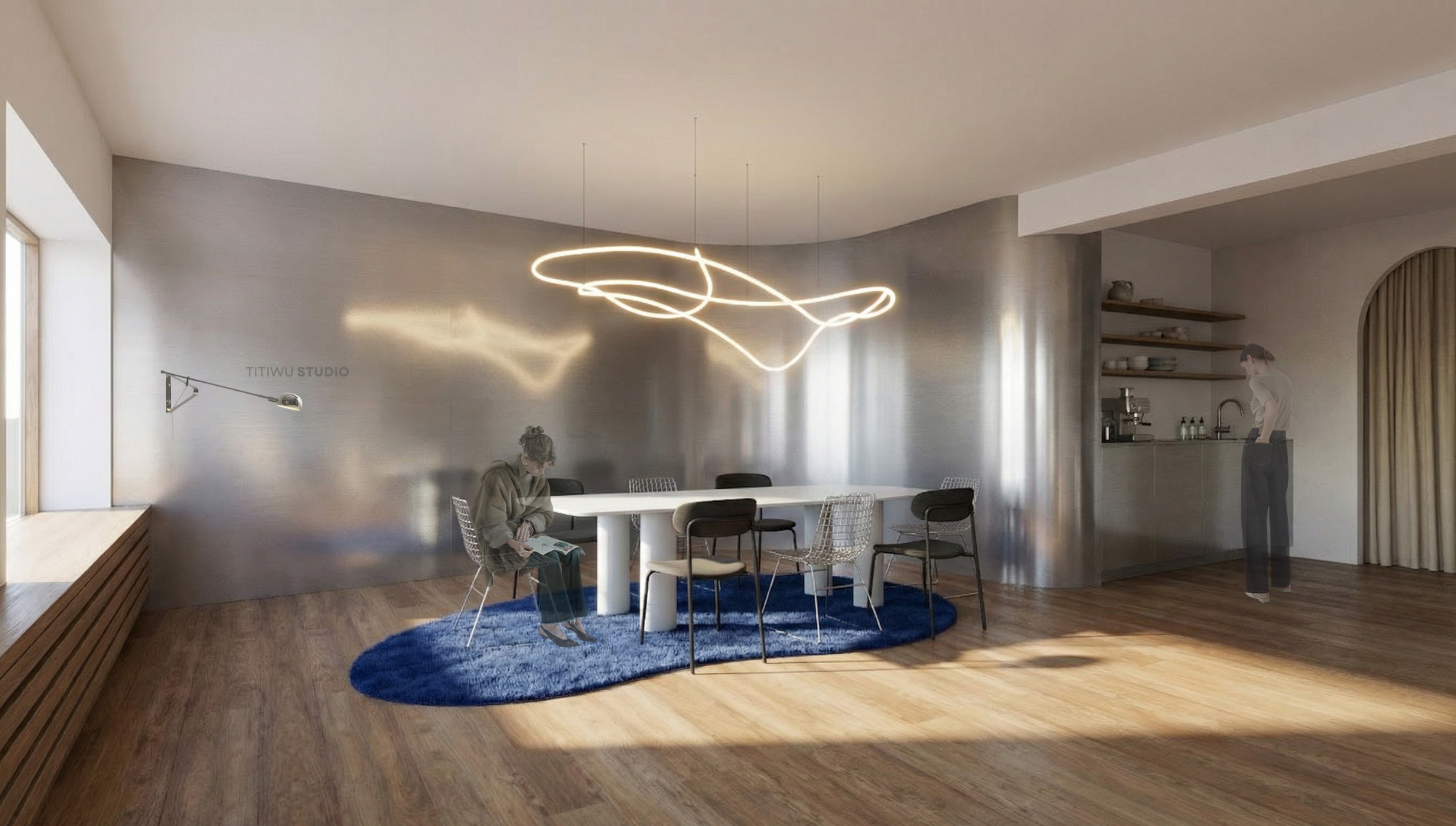 Ausgangspunkt war eine zentrale Raumecke, die die Energie spürbar nach unten gezogen hat. Durch eine gezielte, weich geführte und neu installierte Raumkurve wurde diese Zone aufgelöst und die Energie neu gelenkt. Die Form zieht sich bewusst in das Küchenmöbel weiter und schafft einen fließenden Übergang im Raum zur “coffee curve”.